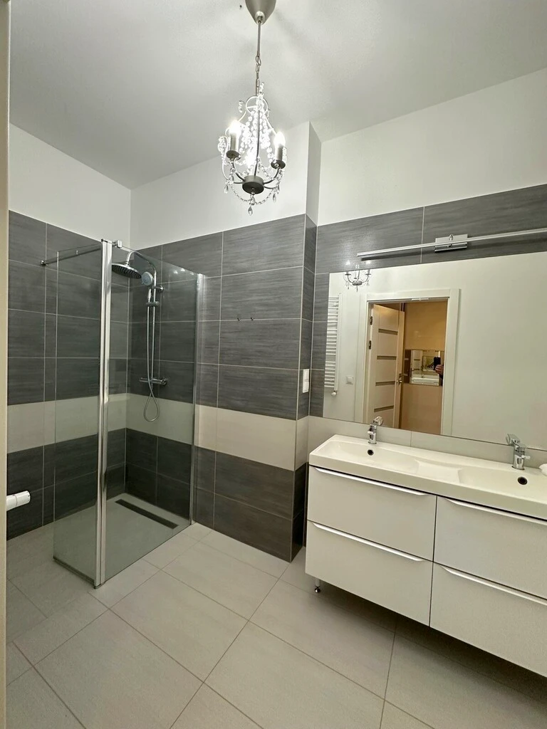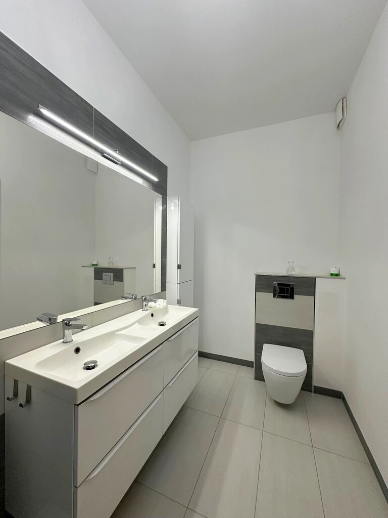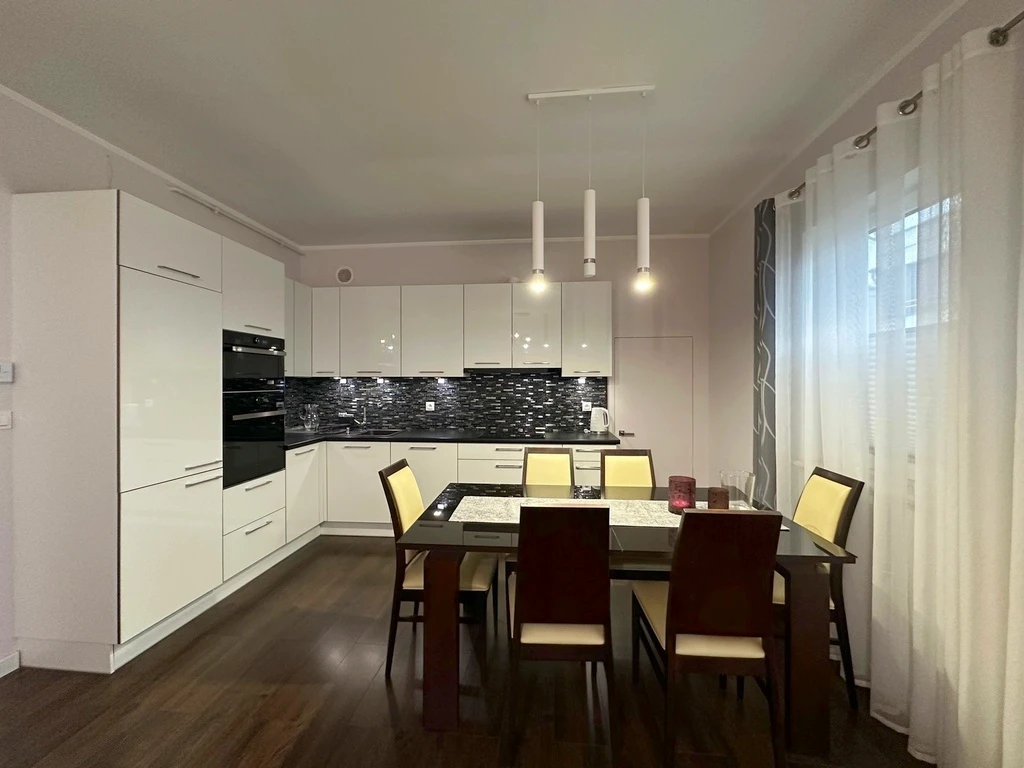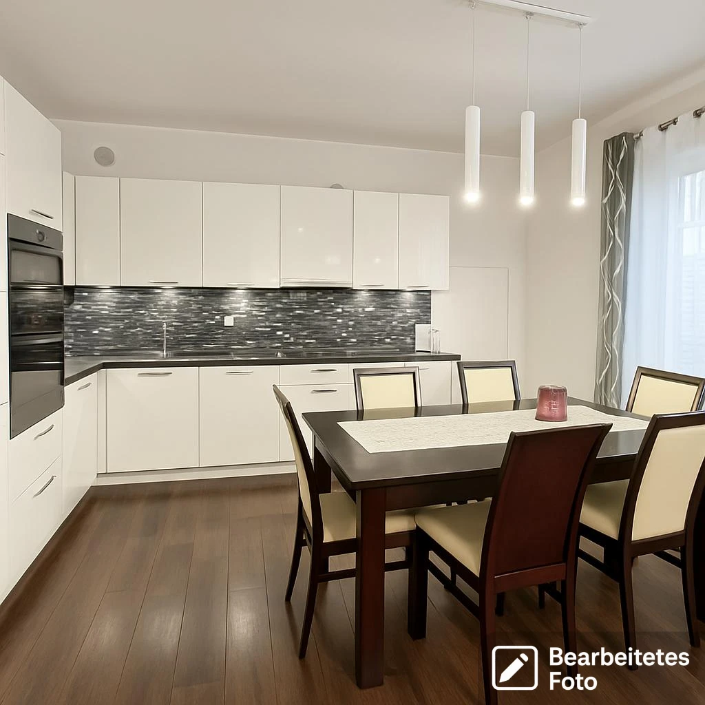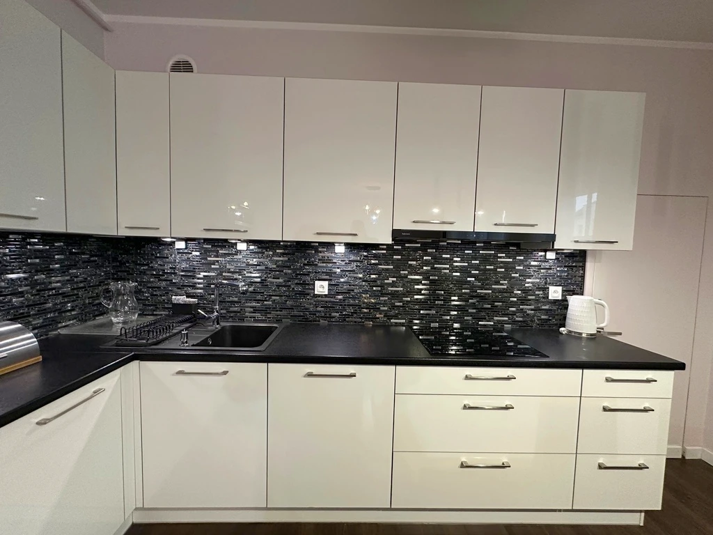Dieses hochwertig ausgestattete Apartment überzeugt durch stilvolles Design, großzügige Raumaufteilung und eine exklusive Ausstattung. Die Kombination aus hellen Elementen, wie der eleganten weißen Einbauküche mit schwarzen Steinarbeitsplatten, hochwertigem Bodenbelag und einem modernen Badezimmer verleiht dem Zuhause ein einzigartiges Ambiente mit einem Hauch von Luxus.