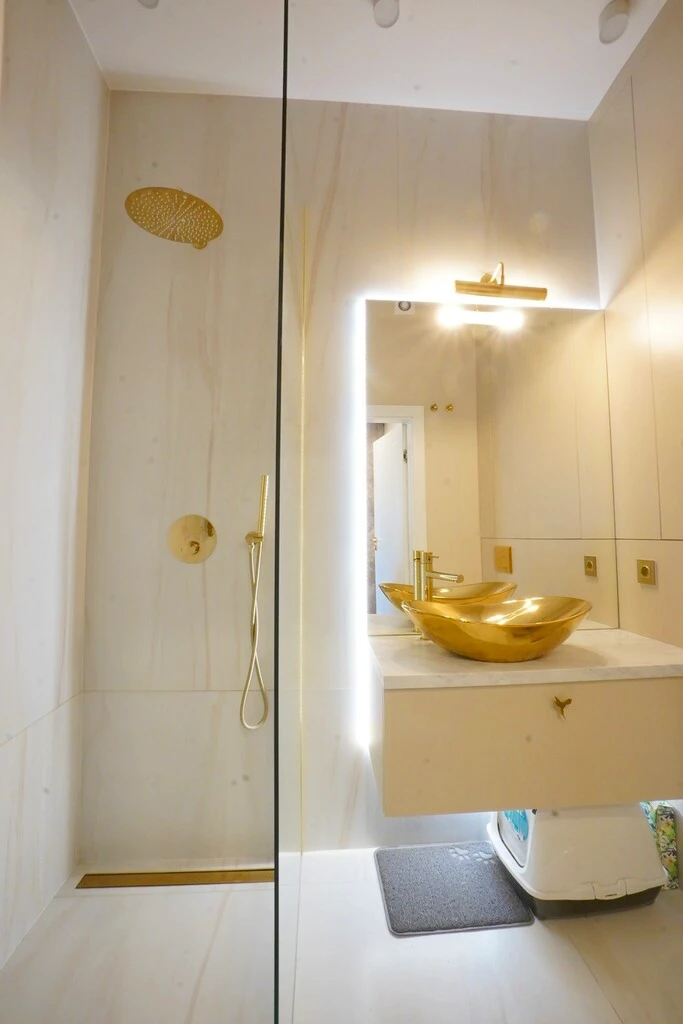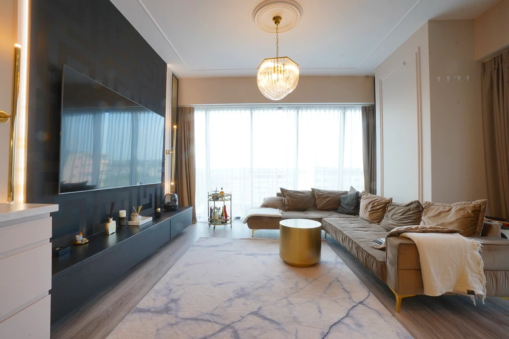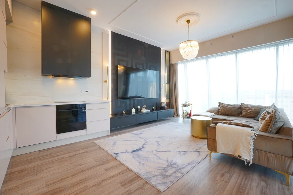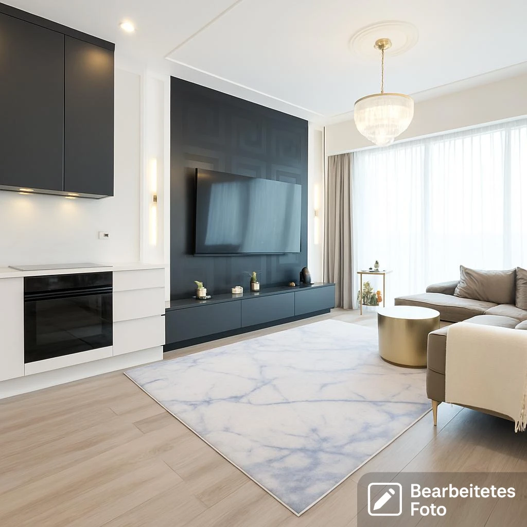 Das Herzstück des Apartments ist der offen gestaltete Wohnbereich. Dieser teilt sich stilvoll in eine gemütliche Lounge-Zone und einen Essbereich mit moderner Küchenzeile. Die geschmackvolle Beleuchtung unterstreicht das moderne Ambiente und schafft eine angenehme Atmosphäre.