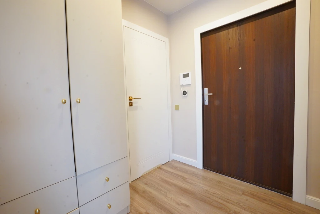 Die Wohnung wurde mit viel Liebe zum Detail und unter Verwendung hochwertiger Materialien ausgestattet. Schon im Eingangsbereich überzeugt eine großzügige Garderobe mit integrierten Anschlüssen für Waschmaschine und Trockner – clever versteckt und praktisch zugleich.