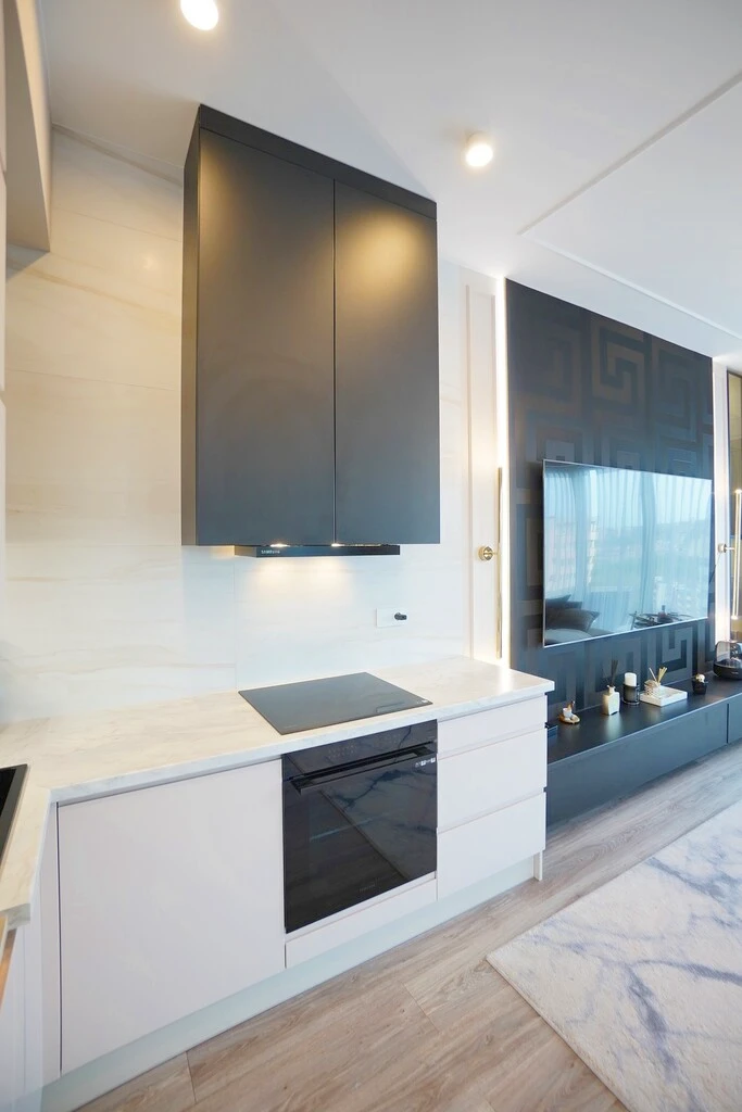 Die moderne Küche ist mit hochwertigen Möbeln und vollständigen Haushaltsgeräten ausgestattet. Dank der offenen Gestaltung ist sie ideal für gemeinsames Kochen und gemütliche Abende mit Gästen.