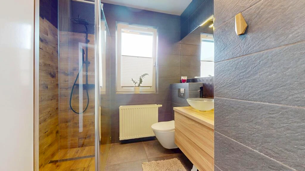 Die moderne Küche mit Fenster bietet viel Tageslicht und schafft ein angenehmes Umfeld zum Kochen und Verweilen. Das großzügige Badezimmer ist praktisch geschnitten und hochwertig ausgestattet.