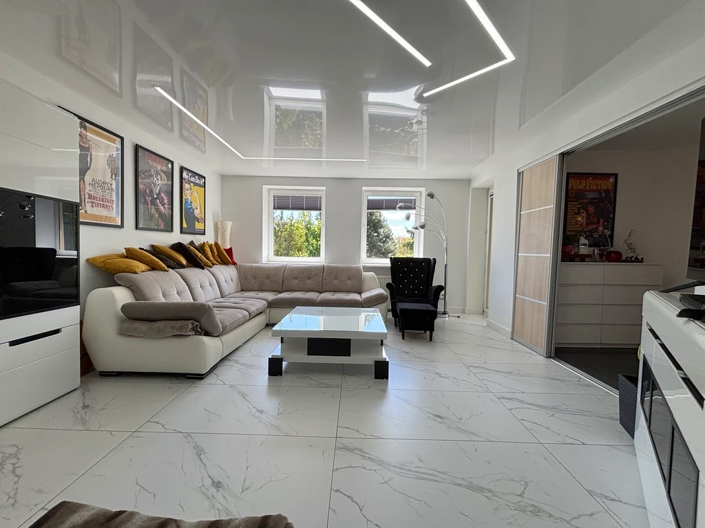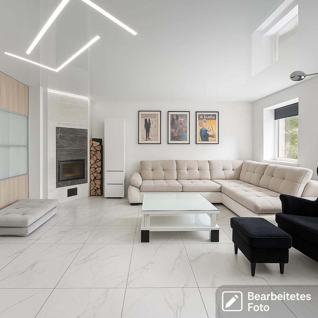 Das Wohnzimmer verfügt über einen gemütlichen Kamin sowie über einen großen, überdachten Balkon mit viel Platz für Sitzmöbel. Auf dem Boden wurde hochwertiger Feinsteinzeug verlegt, die Wände sind glatt verputzt und gestrichen. Die abgehängte Decke ist mit energiesparender LED-Beleuchtung ausgestattet.