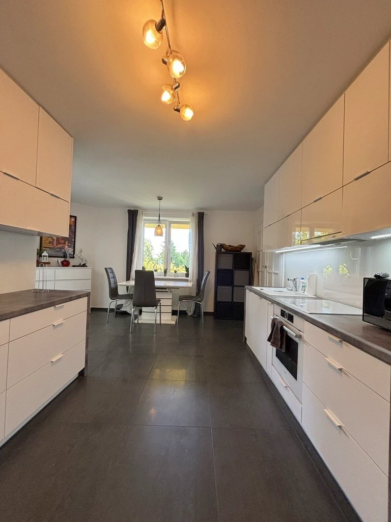 Die geräumige Küche ist offen gestaltet und mit dem Essbereich verbunden. In der Küche ist moderner Lacobel-Glasfliesenbelag verbaut, im Essbereich glatte, gestrichene Wände. Der Boden ist ebenfalls mit Feinsteinzeug gefliest.