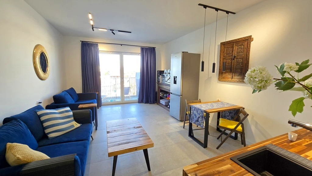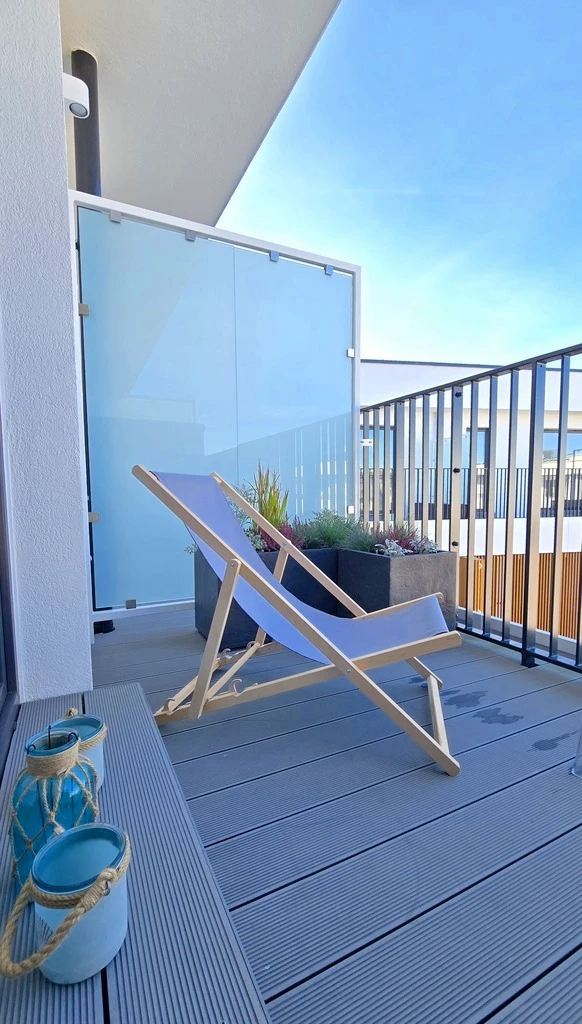 Die Wohnung verfügt über ca. 30 m² Wohnfläche und bietet dank großer Fensterfronten viel Licht und einen schönen Blick in Richtung Meer. Der großzügige Wohnbereich ist mit einer modernen, maßgefertigten Küchenzeile ausgestattet und bietet direkten Zugang zu einer ca. 6 m² großen Terrasse – perfekt für ein Frühstück mit Blick in die Ferne oder entspannte Abende.