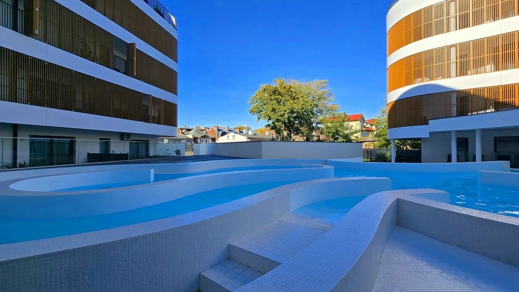 Das Apartment befindet sich im 4. Stockwerk eines der drei architektonisch außergewöhnlichen Gebäude, deren Fassaden die Form von Meereswellen widerspiegeln. Diese ansprechende Gestaltung wird begleitet von einer erstklassigen Qualität im Inneren der Anlage sowie einem umfangreichen Freizeitangebot.