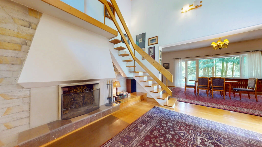- Geräumiges Wohnzimmer mit Kamin – aufgeteilt in zwei Bereiche – und direktem Zugang zur ca. 21 m² großen Terrasse