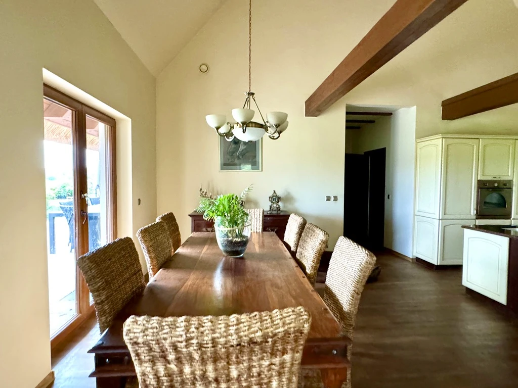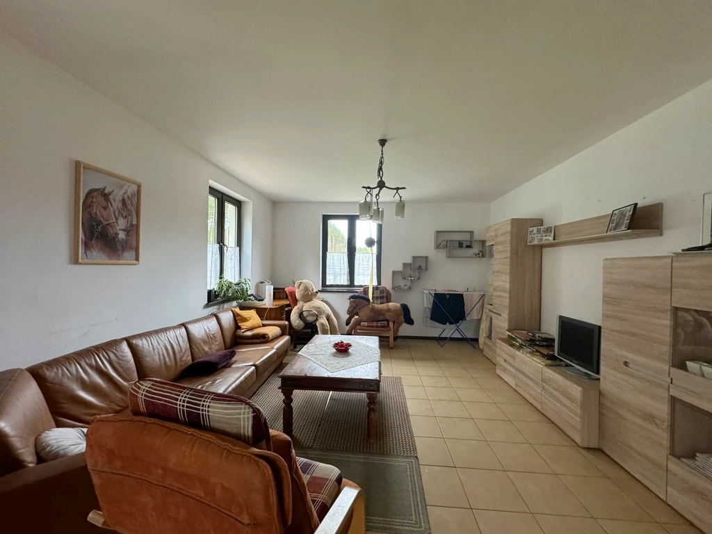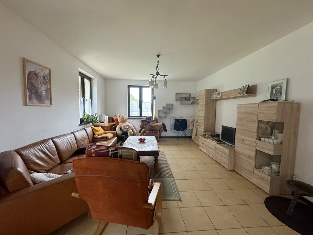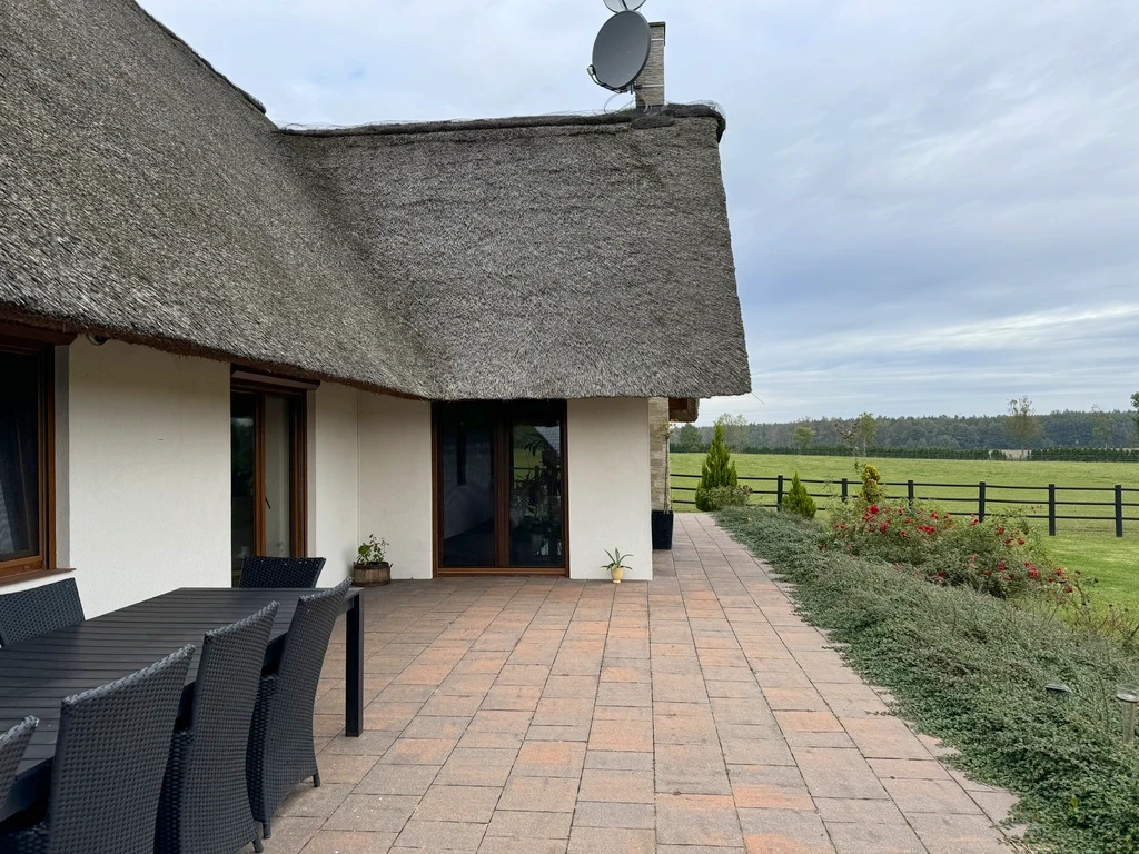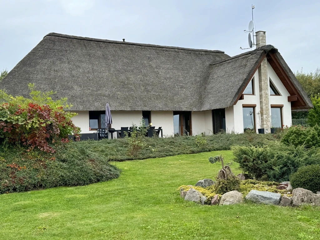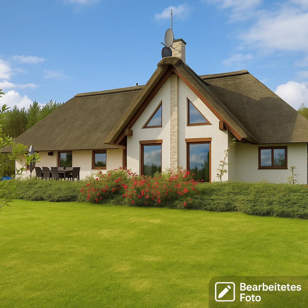 Das 2016 errichtete Wohnhaus mit einer Gesamtfläche von 203 m² überzeugt durch seine durchdachte Aufteilung, hochwertige Ausstattung und charmante Details wie ein Reetdach. Das Haus liegt leicht erhöht, mit Blick auf die grüne Landschaft und den angrenzenden Wald – eine ruhige, inspirierende Umgebung.