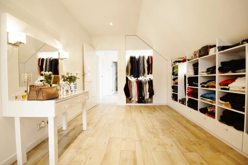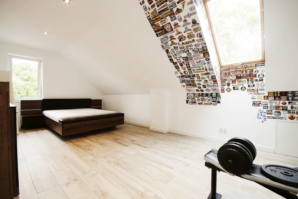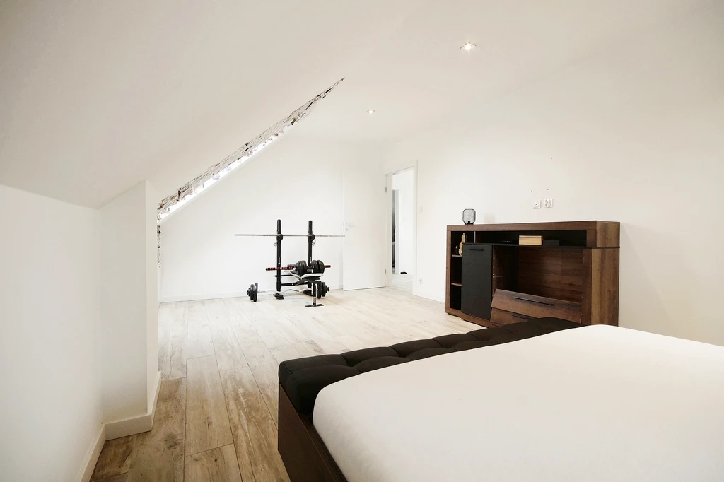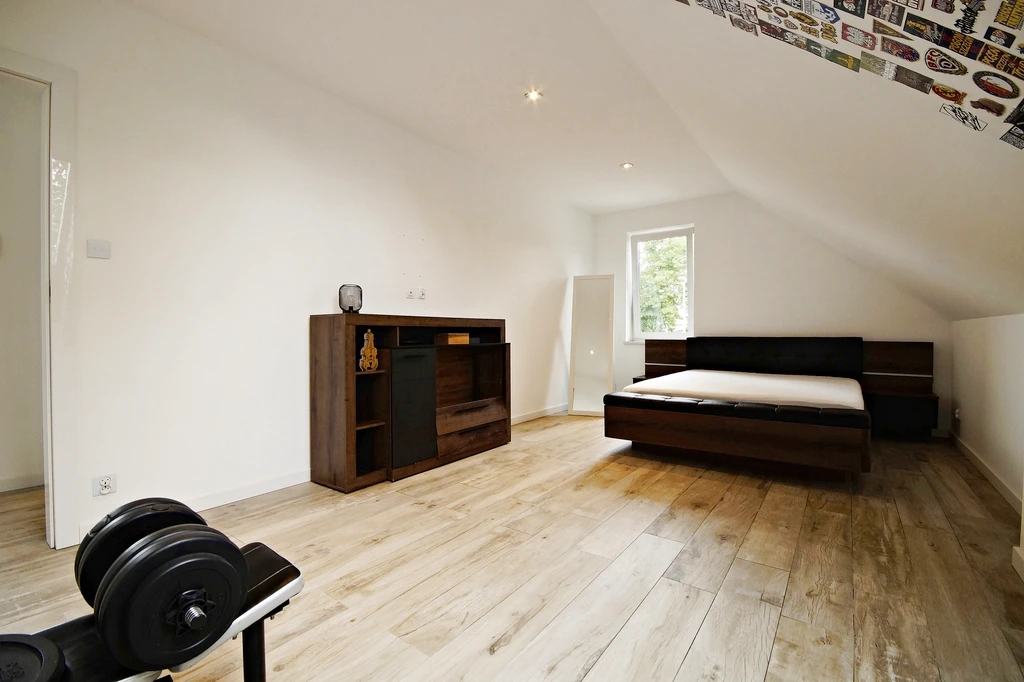 Im Obergeschoss befinden sich drei Schlafzimmer – eines wird aktuell als Ankleide genutzt – sowie ein komfortables Badezimmer mit freistehender Badewanne, WC und Waschbecken. Zusätzlich gibt es einen zugänglichen Dachbodenbereich, der als Stauraum dient.
