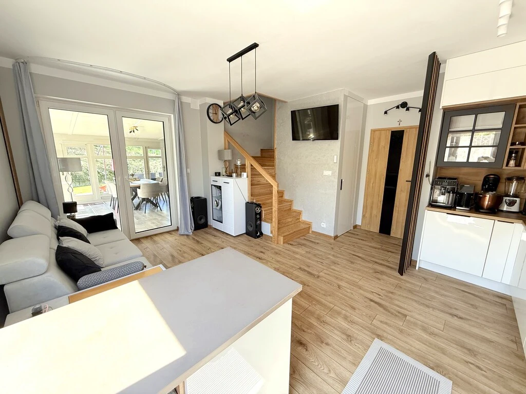 Erdgeschoss: - Wohnzimmer mit offener Küche (ca. 22 m²), Zugang zum beheizten Wintergarten (ca. 20 m²) und weiter auf die großzügige Terrasse (ca. 12 m²) - Speisekammer unter der Treppe - Gäste-WC (ca. 4 m²) - Eingangsbereich mit Garderobe und Flur