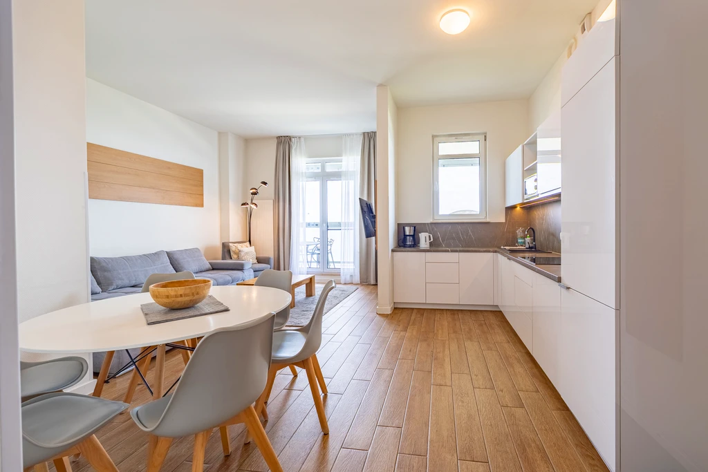 Erleben Sie höchsten Wohnkomfort an der Ostseeküste – im 15. und damit obersten Stockwerk eines renommierten Apartmenthauses in Misdroy erwartet Sie ein außergewöhnliches 80 m² großes Apartment mit Panoramablick auf das offene Meer.
