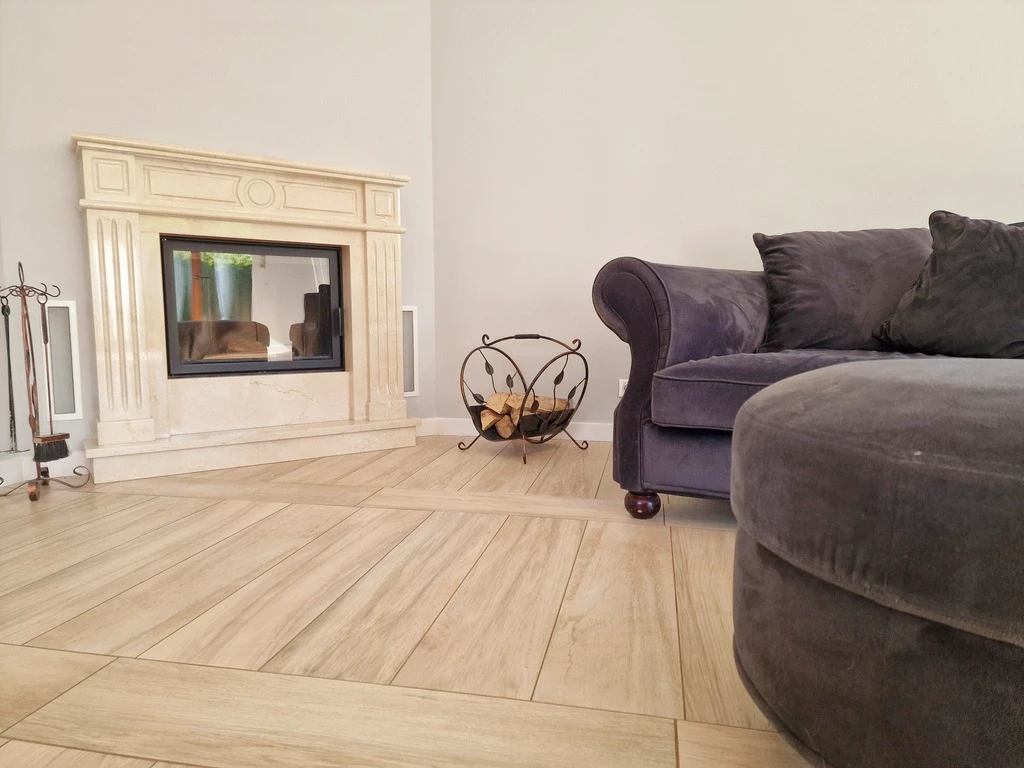 - Großzügiges Wohnzimmer mit Essbereich, stilvoller Kamin, terrakottafliesen Boden, Zugang zur Terrasse und Garten mit automatischem Bewässerungssystem