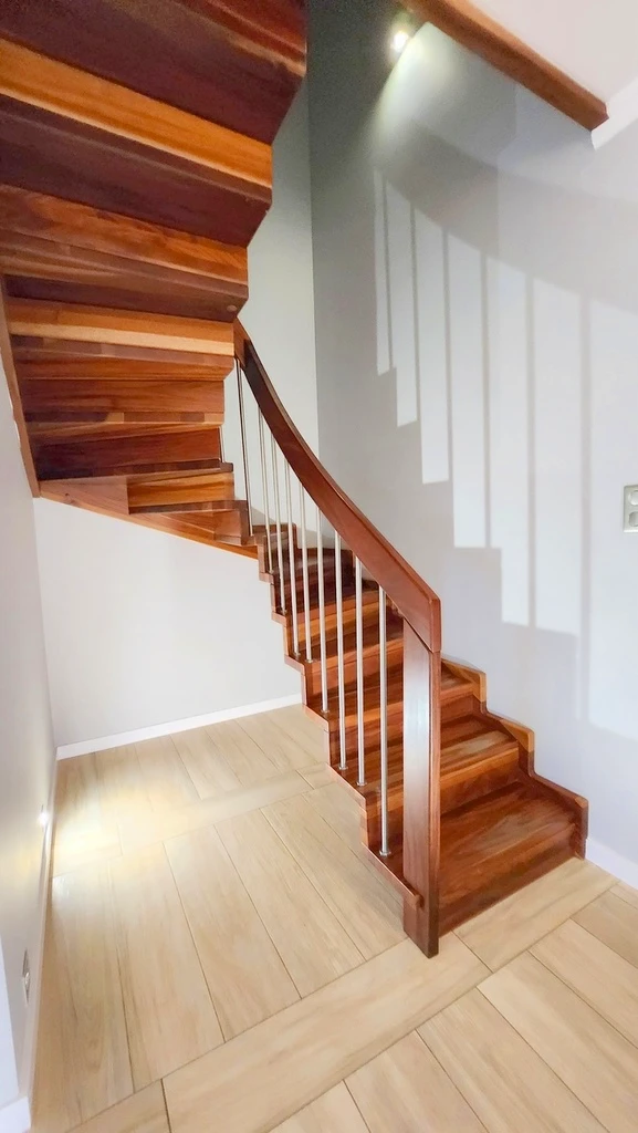 Elegante Holztreppe sowie Fußböden im Obergeschoss aus exotischem Massivholz verleihen dem Haus eine warme Atmosphäre.
