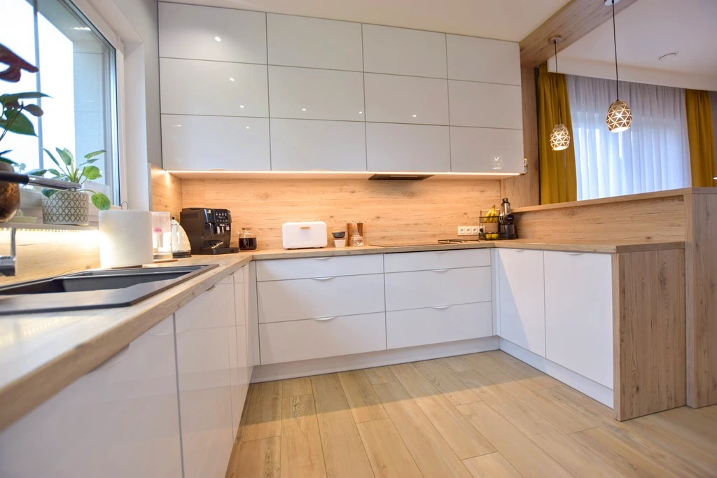 - Fliesen in Holzoptik und glatte, gestrichene Wände