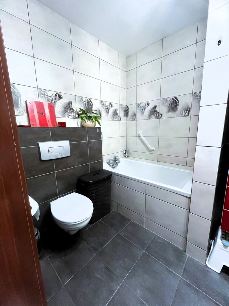 - Große, stilvolle Badezimmer (5,8 m²) mit Badewanne, Dusche, Waschbecken und WC
