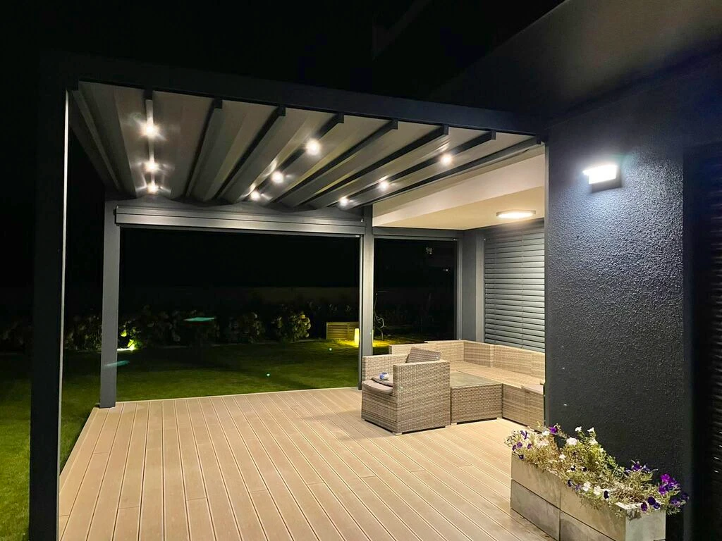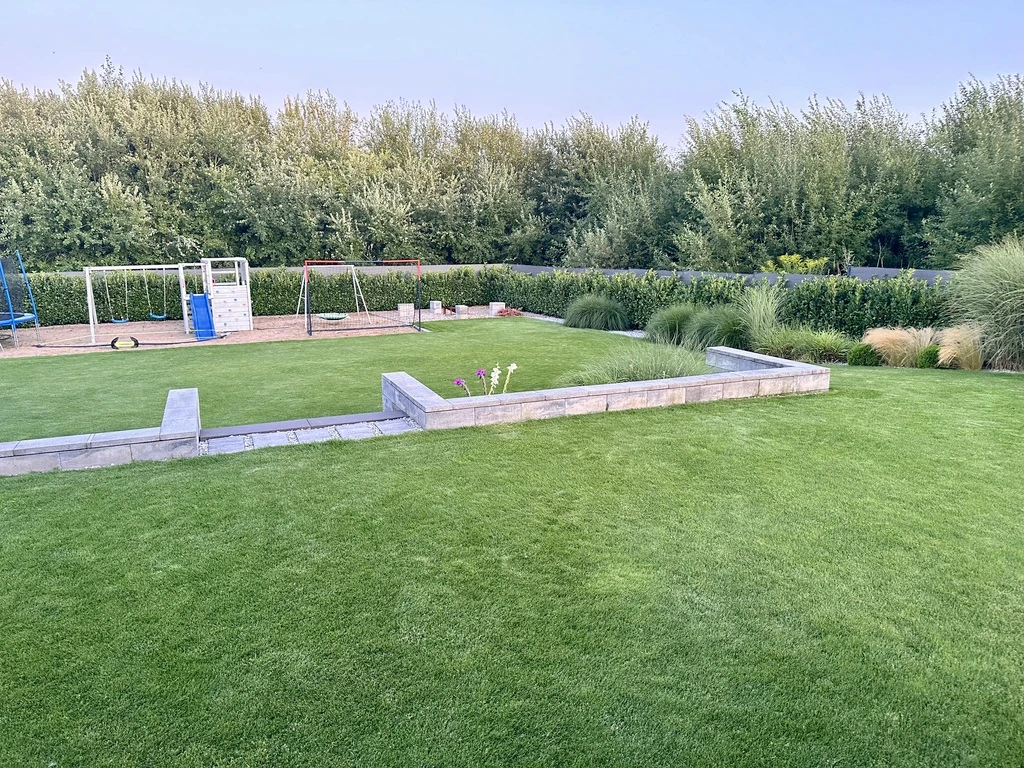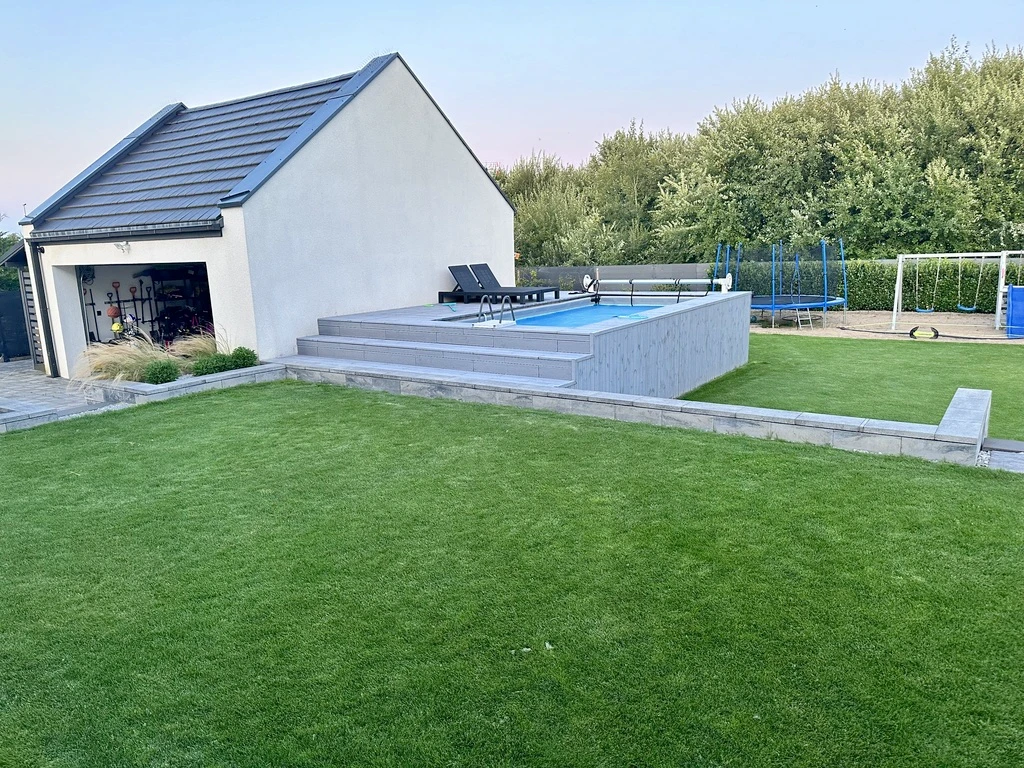 Der liebevoll geplante Garten wurde von einem Landschaftsarchitekten entworfen und ist mit einer automatischen Bewässerung über eigene Brunnen ausgestattet – das garantiert das ganze Jahr über ein gepflegtes Erscheinungsbild. Ein Highlight ist der private Außenpool mit beheiztem Wasser sowie eine stilvolle Aluminium-Pergola von Tarasola mit elektrischem Antrieb.