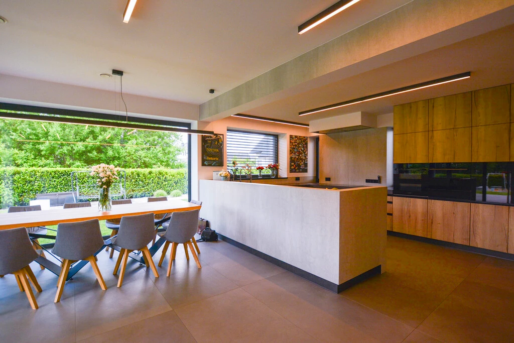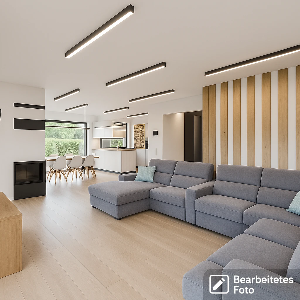 Das Herzstück dieses Hauses ist ein großzügiger, lichtdurchfluteter Wohnbereich mit offenem Küchenkonzept (ca. 60 m²). Die elegante Küche überzeugt mit hochwertigen Einbaugeräten und einem stilvollen Design – ideal für Hobbyköche und Genießer.