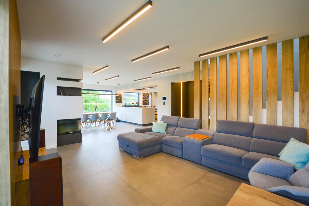 Der angrenzende Wohnraum mit gemütlichem Kamin schafft eine einladende Atmosphäre für entspannte Abende oder gesellige Treffen. Vom Wohnzimmer gelangen Sie direkt auf die Terrasse und den wunderschön gestalteten Garten – perfekt zum Entspannen im Freien.