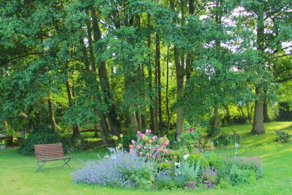 Das weitläufige Grundstück ist eine wahre Oase der Ruhe. Der gepflegte Garten beeindruckt mit altem Baumbestand, liebevoll gepflegten Beeten und zahlreichen Rückzugsorten:
