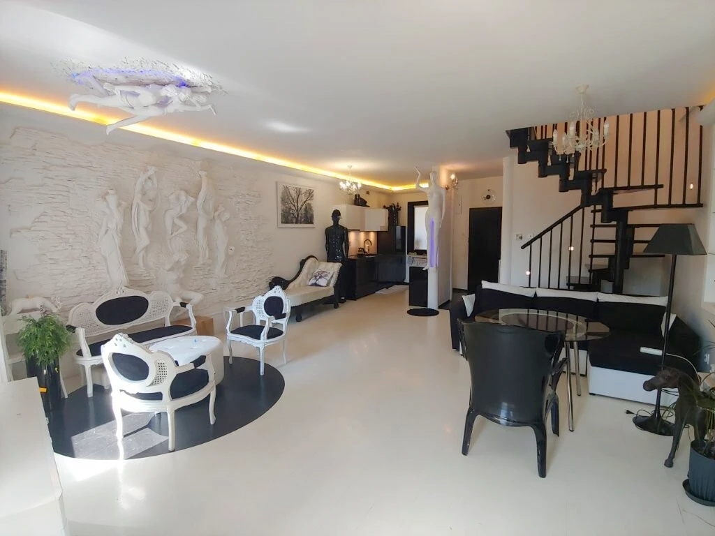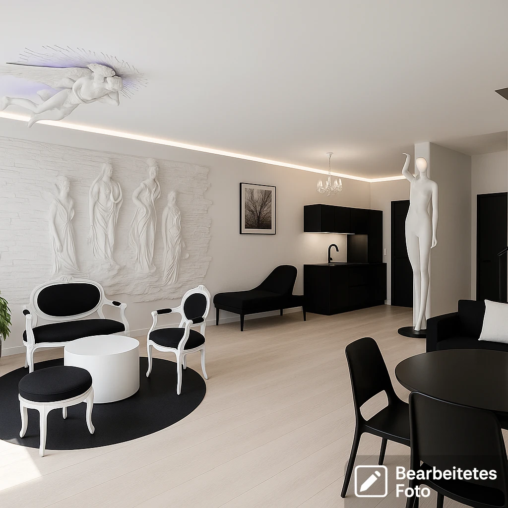 Ein Highlight im Wohnzimmer sind eine kunstvolle Wandgestaltung mit Skulpturen und hochwertige Bodenbeläge – elegante Paneele und glatte, frisch gestrichene Wände sorgen für ein stilvolles Ambiente.