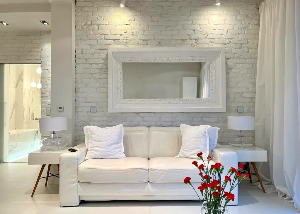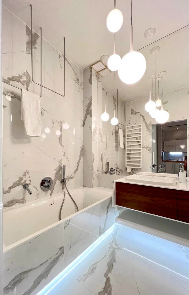 - Hochwertige Materialien: Natursteinwände, elegante Fliesen in Cremefarbe, Teppichboden im Schlafzimmer