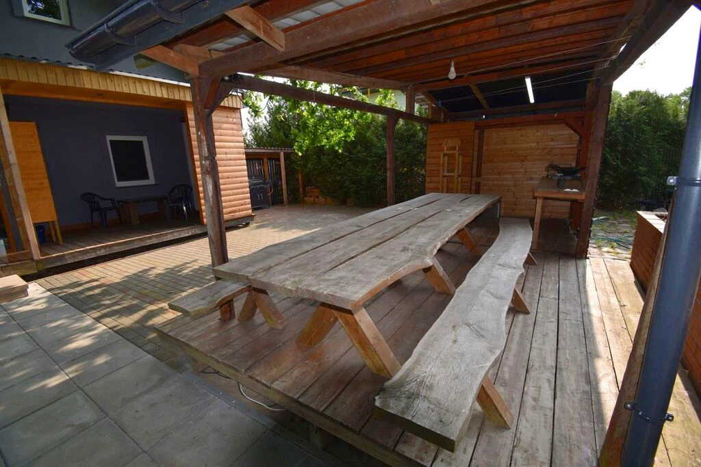 - Idyllische Gartenlaube unter einem 160 Jahre alten Eichbaum mit Sommerküche, großem Esstisch sowie separatem Abstellraum für Fahrräder und Gartengeräte