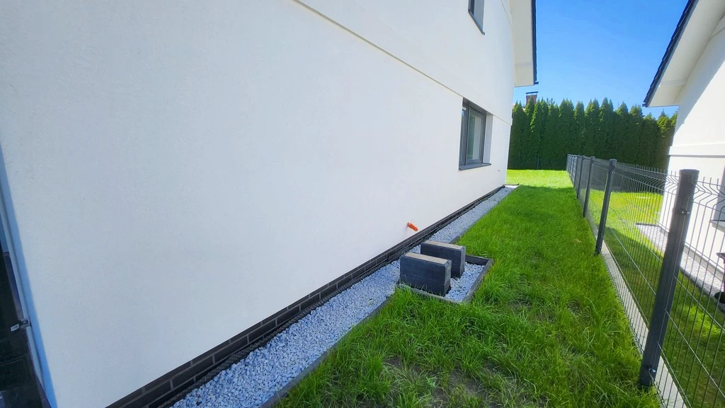 Die rechte Haushälfte steht auf einem Grundstück von 301 m² – vollständig umzäunt und hübsch angelegt. Der Preis beträgt €330.000 (PLN 1.399.000).