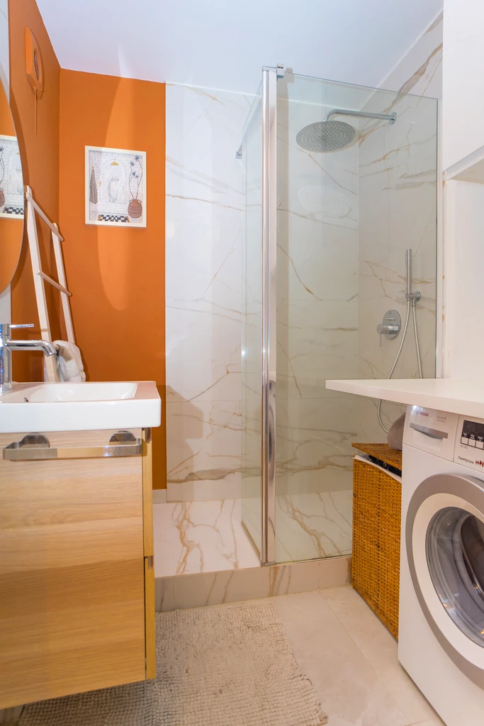 - Badezimmer mit moderner Duschkabine, Waschbecken und Waschmaschine
