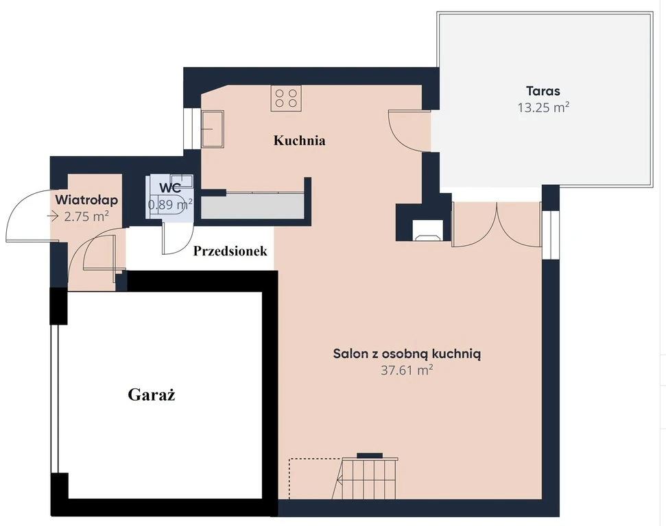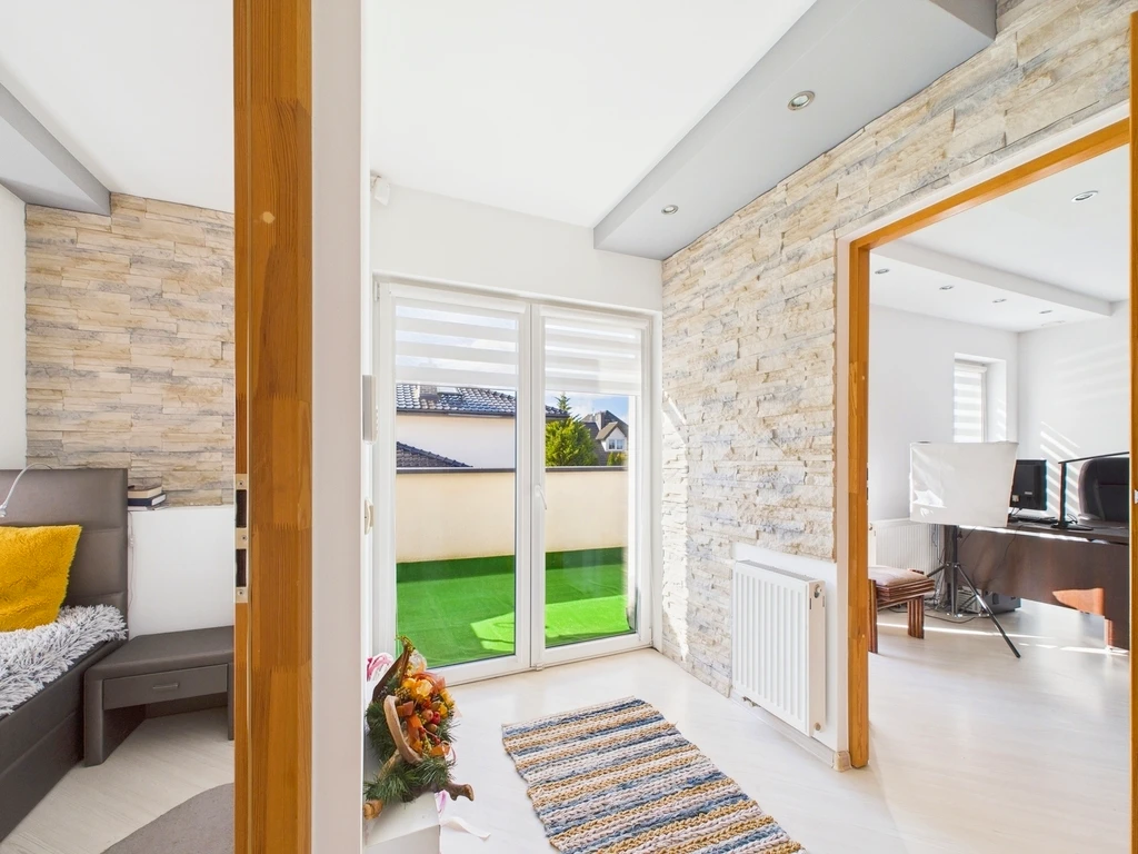 Im Erdgeschoss erwartet Sie ein großzügiger und heller Wohnbereich mit Kamin – perfekt für gemütliche Abende zu Hause. Die Fläche von ca. 37,61 m² verbindet Wohnzimmer und angrenzende Küche (separat mit 8,5 m²), welche vollständig ausgestattet ist (Kühlschrank, Geschirrspüler, Elektroherd, Ofen). Ein separates Gäste-WC (0,89 m²) sowie ein praktischer Windfang (2,75 m²) runden das Erdgeschoss ab. Vom integrierten ca. 18 m² großen Garagenbereich haben Sie direkten Zugang zum Haus.
