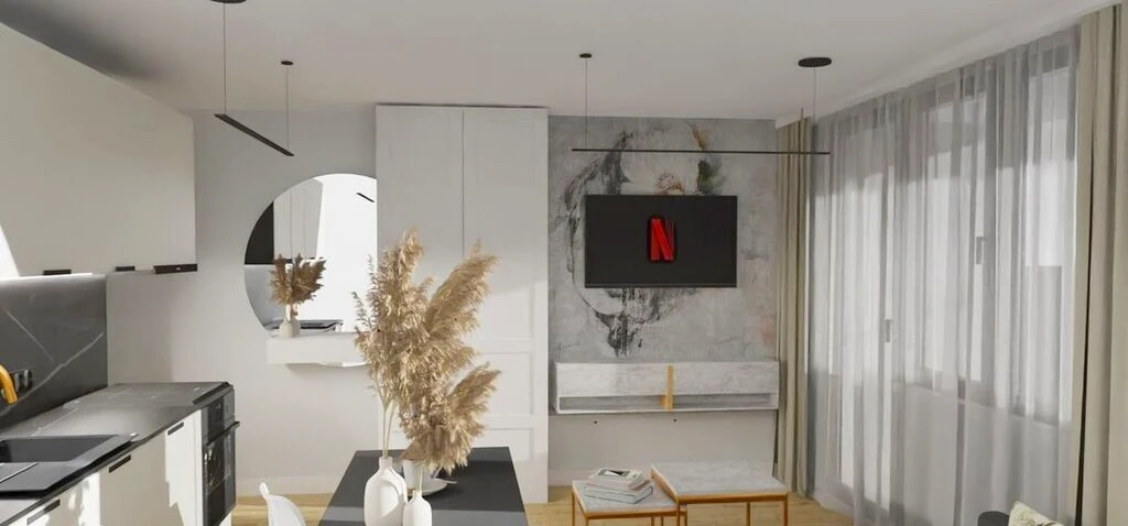 - Wohnzimmer mit offener Küche: 34,36 m² – direkter Zugang zu Badezimmer, Schlafzimmer und Balkon