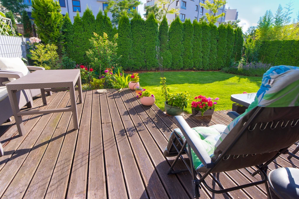 Das Highlight ist der private Garten, perfekt für entspannte Stunden im Grünen, mit einer praktischen Holzlaube zur Unterbringung von Gartengeräten und Rasenmäher.