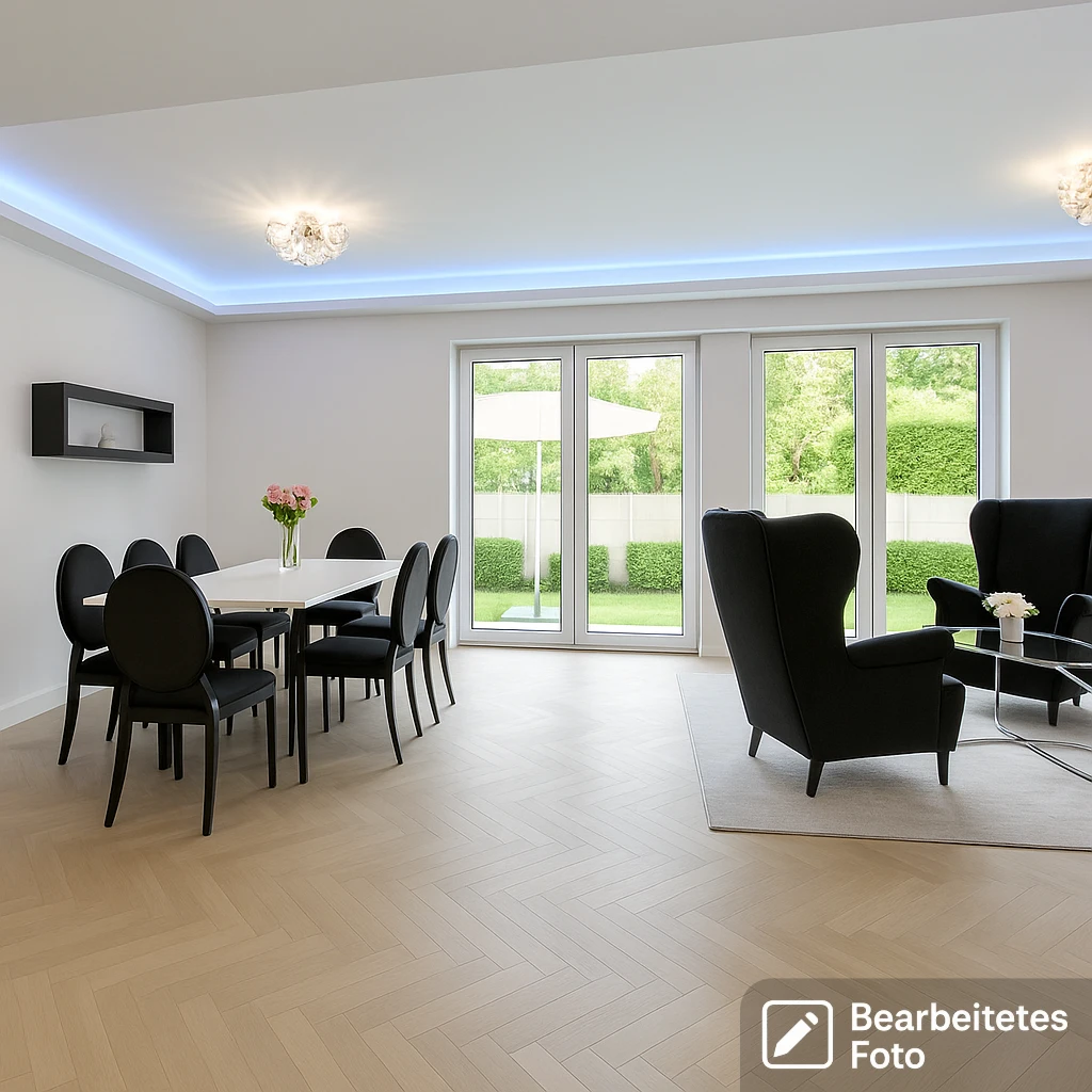 - Großzügiges und helles Wohnzimmer (30,42 m²) mit offener Einbauküche und direktem Zugang zur Terrasse und dem gepflegten Garten.