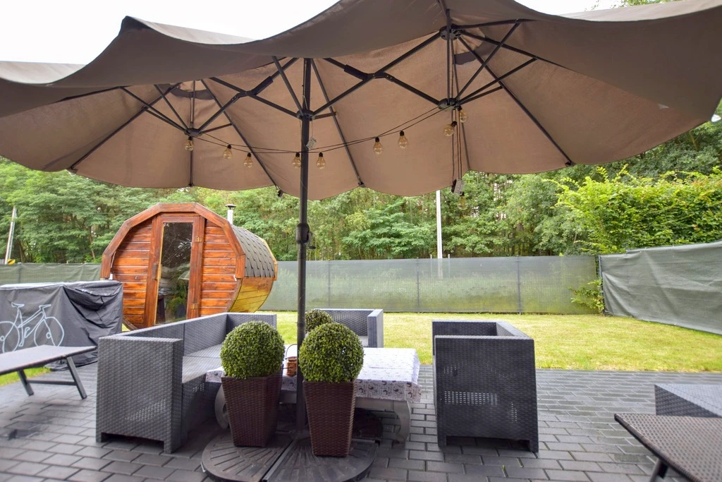 Der liebevoll angelegte Garten lädt zum Entspannen und Genießen ein. Auf dem Grundstück befindet sich zusätzlich eine freistehende Holzofen-Sauna – ein echtes Highlight! Die Sauna kann optional für €2.820 (PLN 12.000) übernommen werden.
