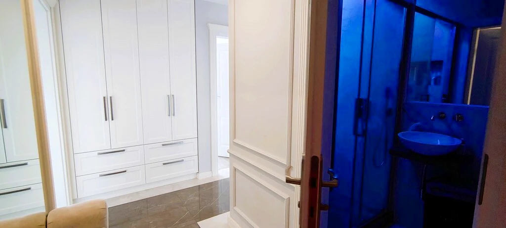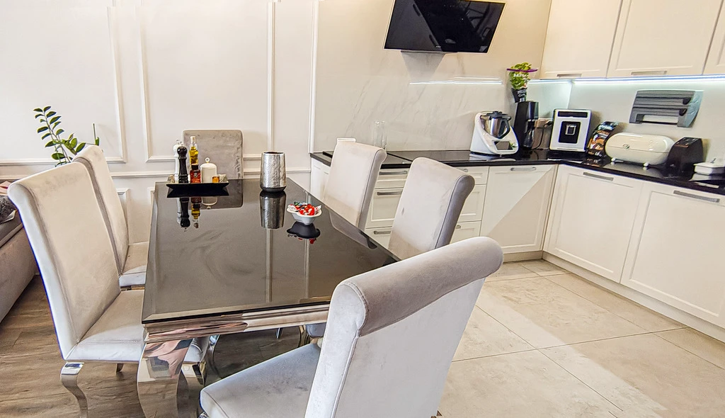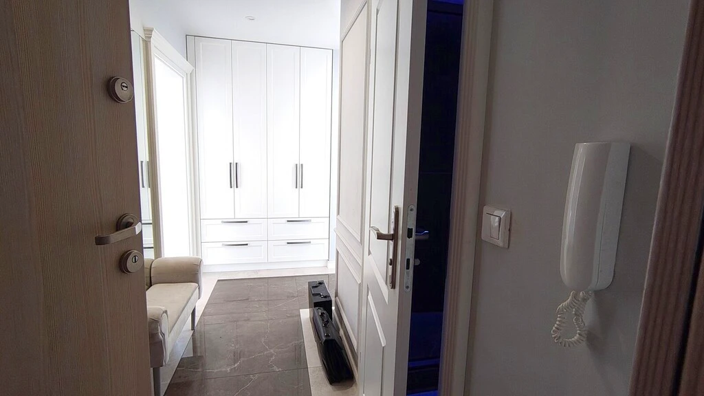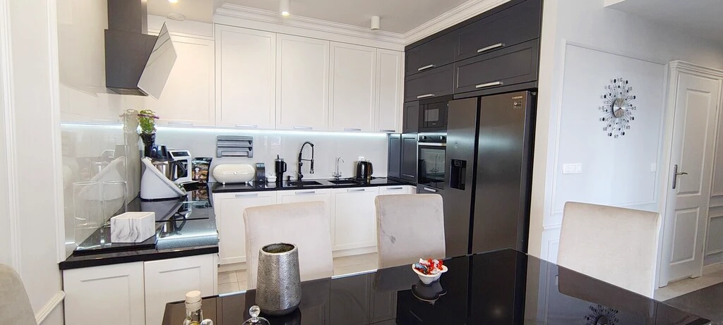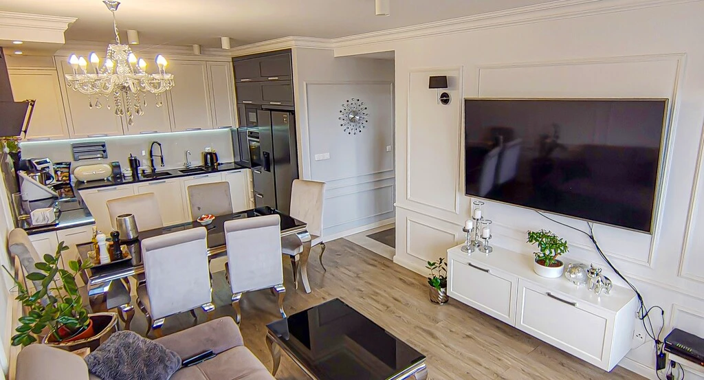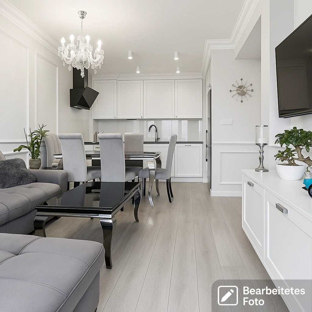 Das Apartment wurde mit hochwertigen Materialien fertiggestellt. Edle Fußböden (Paneele), moderne Einbauküche mit Geräten wie Kühlschrank, Backofen, Geschirrspüler und Mikrowelle – alles ist direkt bezugsbereit. Die Ausstattung überzeugt sowohl ästhetisch als auch funktional.