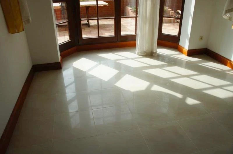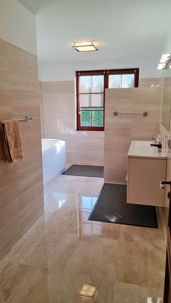 Im Erdgeschoss befinden sich großformatige, geschliffene Feinsteinzeugfliesen auf ca. 90 m². Küche, Bäder und WC sind hochwertig verfließt. Teilweise sind die Innenräume bereits gestrichen (Küche mit Essbereich, Garderobe, Flur sowie zwei Zimmer der abgetrennten Einheit). Massivholztreppen aus Buchenholz führen ins Obergeschoss.