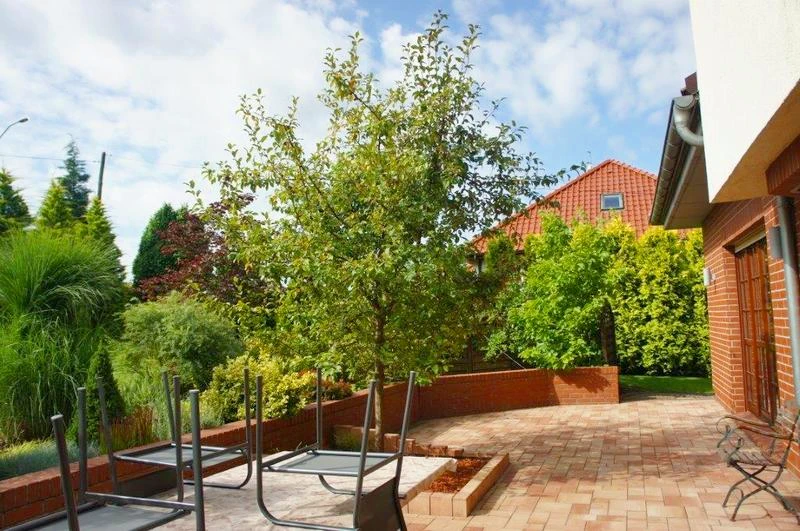 Das Anwesen liegt auf einem leicht erhöhten, ebenen Grundstück von ca. 1.040 m² mit gepflegtem, schön angelegtem Garten und Zierpflanzen. Ein Zufahrtsweg in Form einer ruhigen Sackgasse führt zum Haus. Das Grundstück ist von einer eleganten Mauer mit dekorativen Schmiedegittern umgeben. Ein elektrisches Einfahrtstor sorgt für Komfort und Sicherheit.
