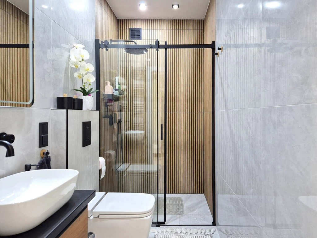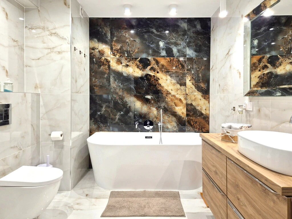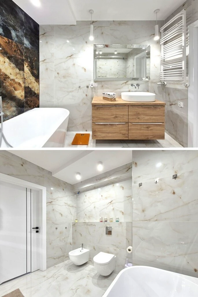 - 2 stilvolle Badezimmer, eines mit begehbarer Dusche, das andere mit freistehender Badewanne, WC, Bidet und eleganter Waschtischlösung