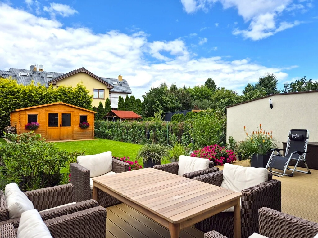 - Schön angelegter Garten mit großer neuer Terrasse (30 m²), Rattanmöbeln, Hängesesseln, Sonnenliegen, Gartenhaus, zahlreichen Pflanzungen, Sprinkleranlage und eigenem Brunnen (keine Kosten für Gartenbewässerung)