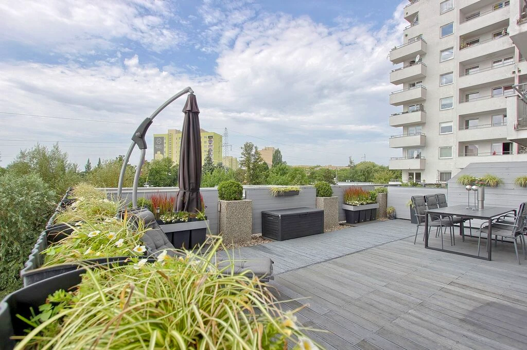 Eines der absoluten Highlights dieser Wohnung ist die ca. 30 m² große, abgeschirmte Terrasse – ein grünes Refugium mitten in der Stadt, das Ihnen maximale Privatsphäre und ein Gefühl von Gartenidylle bietet.