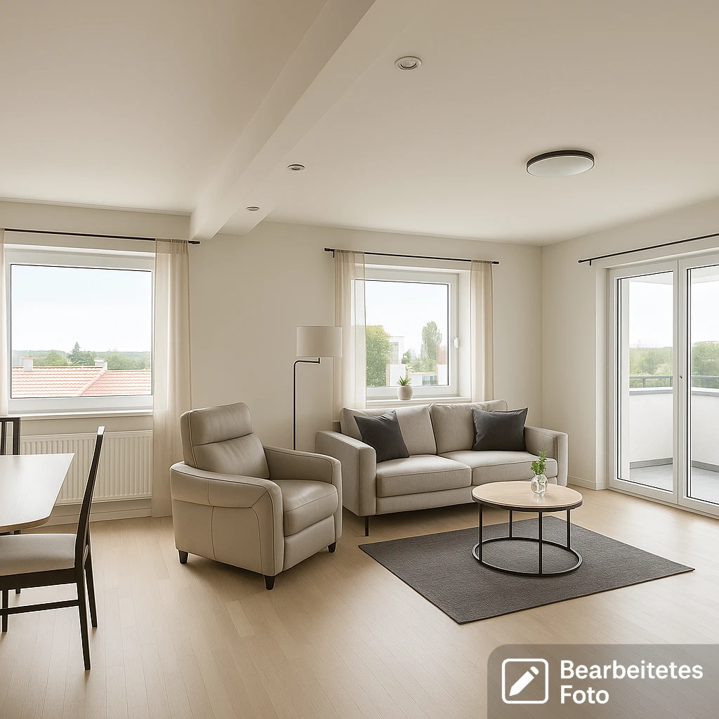 - Das erste Foto in unserer Galerie wurde leicht bearbeitet, um zu veranschaulichen, wie die Wohnung aussehen könnte – beispielsweise durch eine geänderte Wandfarbe. Die nachfolgenden Bilder zeigen den tatsächlichen Zustand der Immobilie.