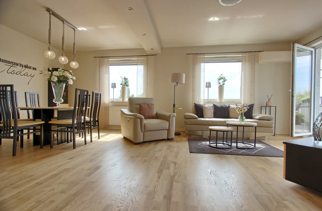 Der Wohnbereich ist mit hochwertigen Holzfußböden ausgestattet, im Badezimmer finden Sie stilvolle Fliesen und Sanitäranlagen gehobener Qualität. Die Ledermöbel im Wohnzimmer sind neu und wurden erst vor einem halben Jahr angeschafft.