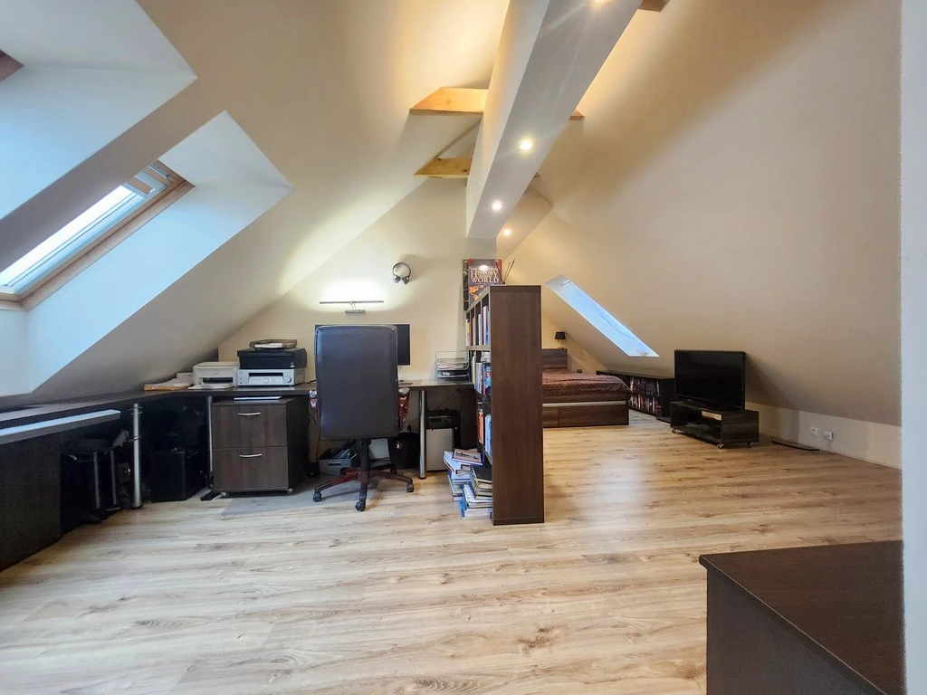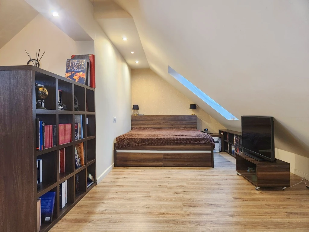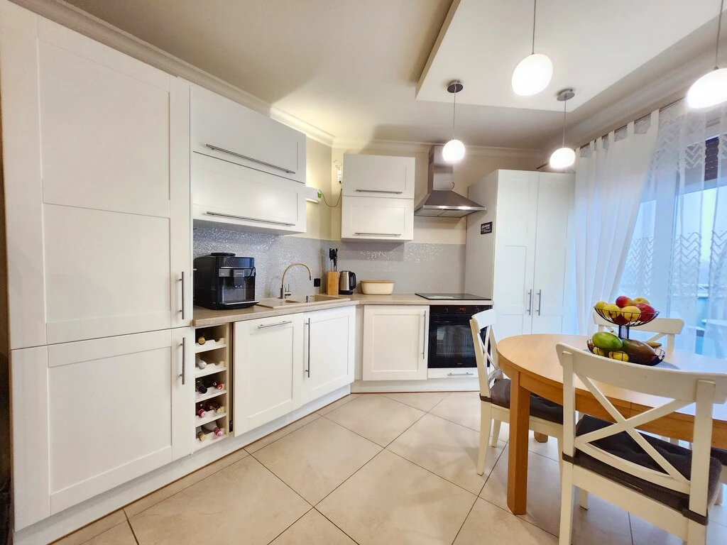 Untere Etage: - Großzügiges, ca. 23 m² großes Wohnzimmer mit Zugang zum Balkon – Lichtdurchflutet und gemütlich - Zwei Schlafzimmer in angenehmer Größe - Separate Küche mit Einbauschränken und Zugang zum zweiten Balkon – praktisch und gut durchdacht - Geräumiges Badezimmer mit Wanne, Dusche, Bidet und WC, geschmackvoll mit modernen Fliesen ausgestattet - Ein einladender Flur mit Einbauschränken rundet das Raumangebot ab
