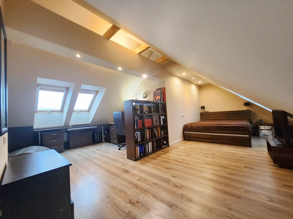 Obere Etage: - Offene, helle Fläche, genutzt als Hauptschlafzimmer mit begehbarem Kleiderschrank und integriertem Arbeitsbereich