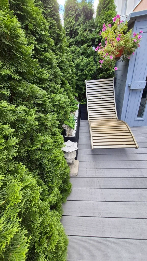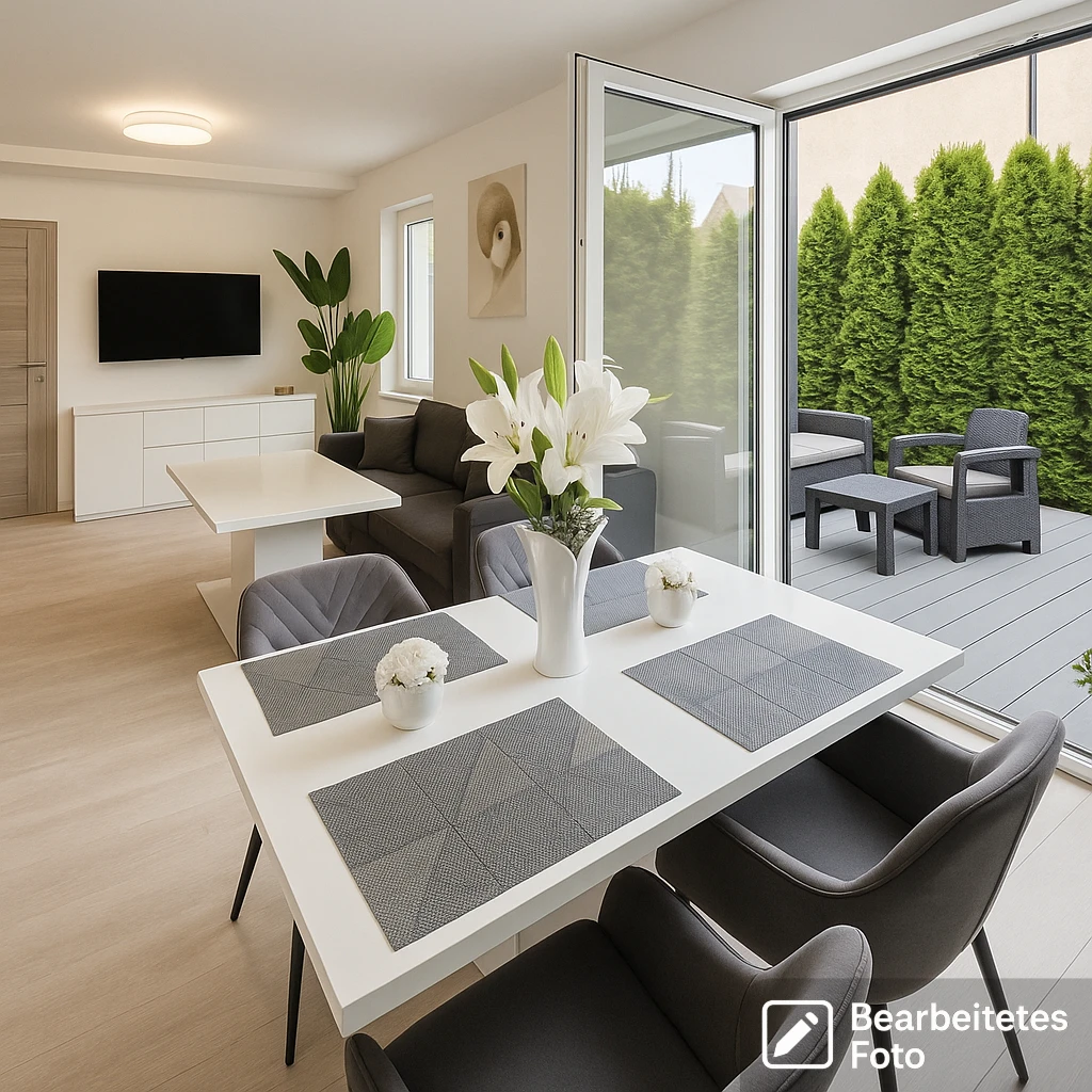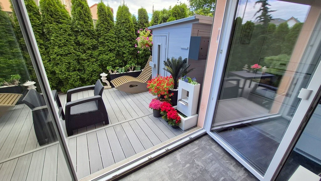 Besonders hervorzuheben ist das offen gestaltete Wohnzimmer mit einer hochwertigen Küche inklusive moderner Einbaugeräte (Kühlschrank, Backofen, Geschirrspüler). Von hier führen Doppeltüren direkt auf eine etwa 40 m² große, grün umrahmte Terrasse, die wie ein verlängerter Wohnraum wirkt. Die Terrasse ist vollständig von Pflanzen umgeben – ein perfekter Rückzugsort mit gemütlichen Sitzgelegenheiten, Gartenarchitektur und einer eigenen Sauna. Eine elektrische Markise bietet Schutz und Komfort bei allen Wetterbedingungen.