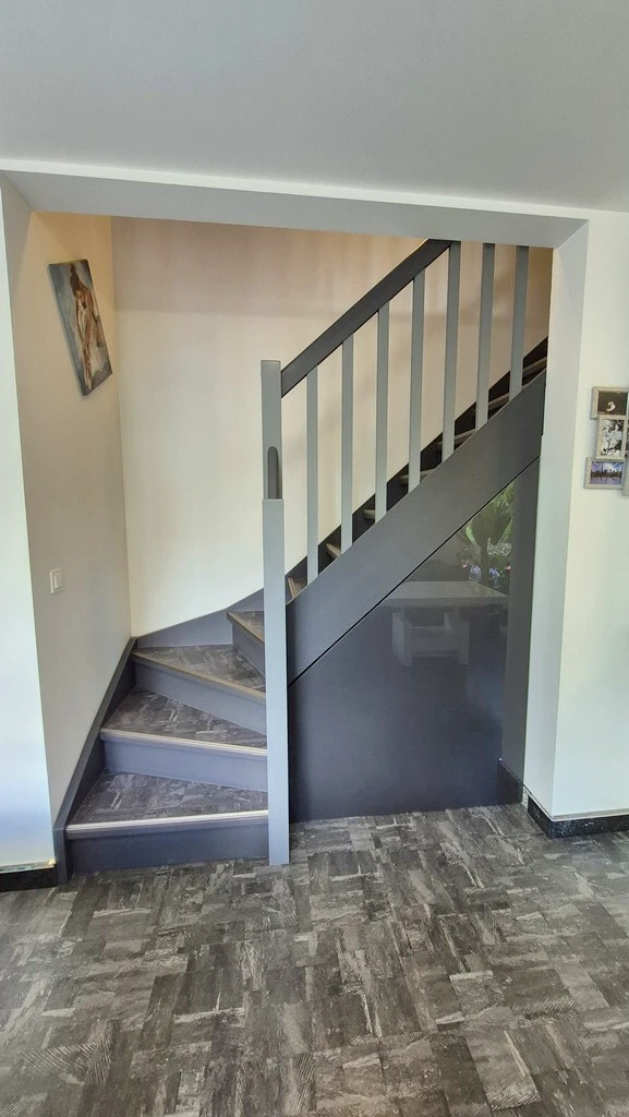Eine elegante Holztreppe führt in das Obergeschoss mit zwei behaglichen Schlafzimmern und einem modernen Badezimmer mit Fenster, WC, Dusche, Waschtisch, Handtuchheizkörper und zahlreichen Schränken – darin auch ein effizienter, gasbetriebener Heizkessel.