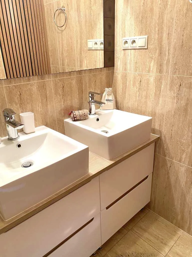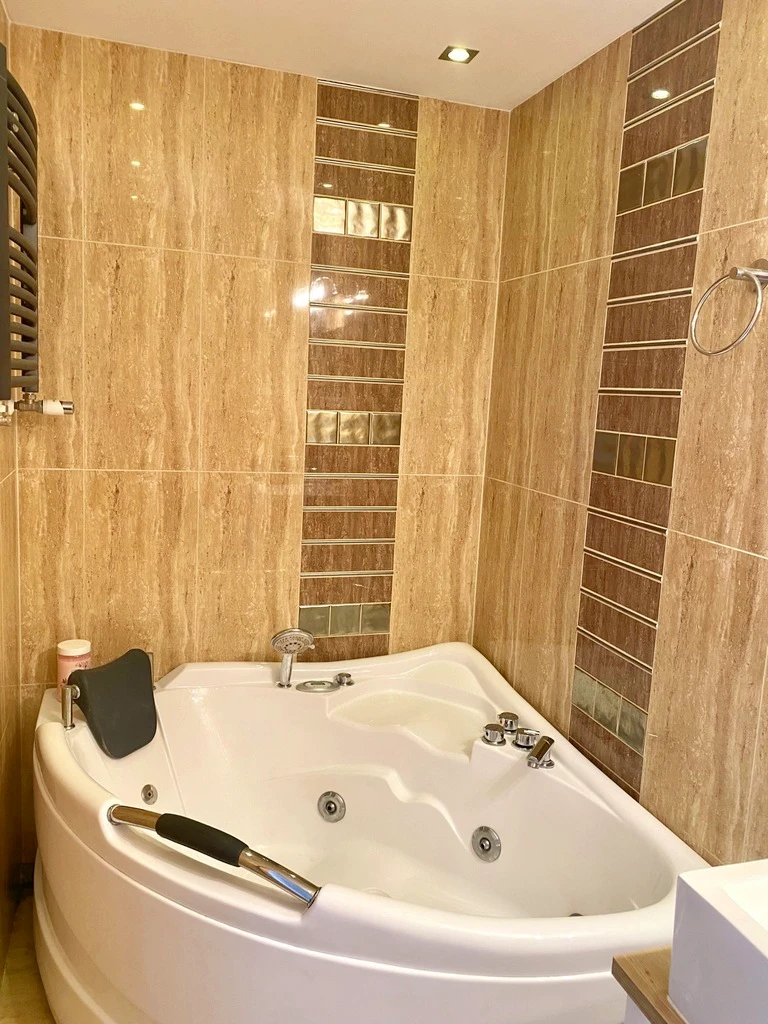 - Badezimmer: Großes Familienbad mit Hydromassage-Badewanne, zwei Waschbecken und zusätzlichem WC