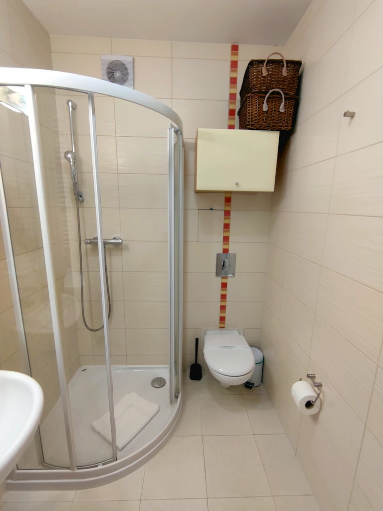 - Badezimmer mit Dusche, Waschbecken, WC und Handtuchheizkörper