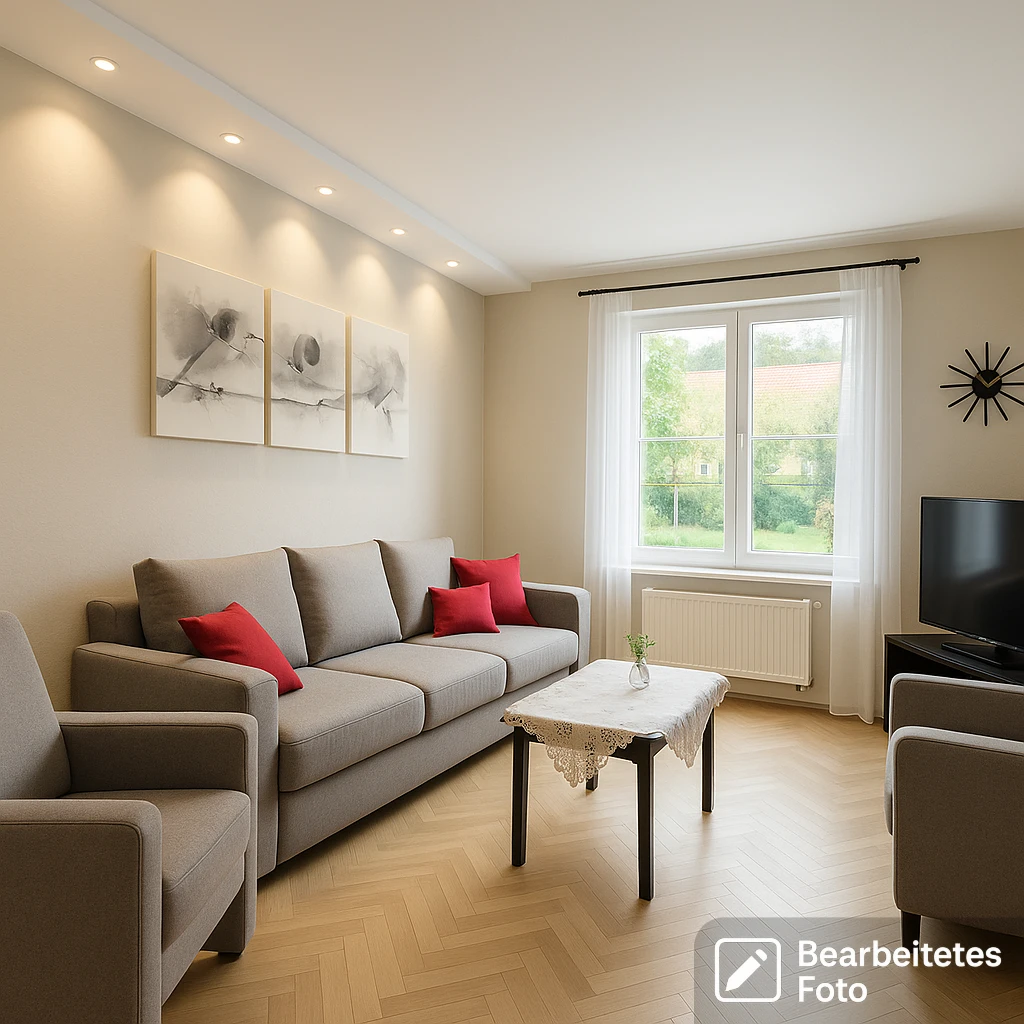 - Das erste Foto in unserer Galerie wurde leicht bearbeitet, um zu veranschaulichen, wie die Wohnung aussehen könnte – beispielsweise durch eine geänderte Wandfarbe. Die nachfolgenden Bilder zeigen den tatsächlichen Zustand der Immobilie.