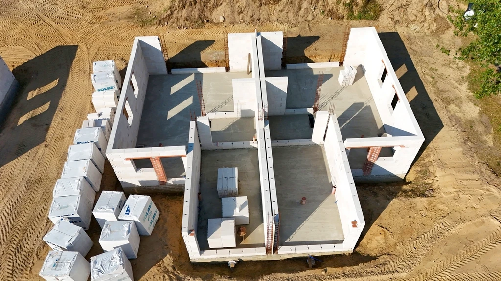 - Erdgeschosswände bereit für die Montage der Zwischendecke