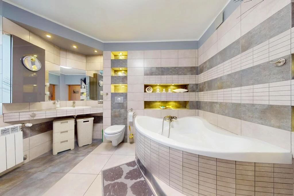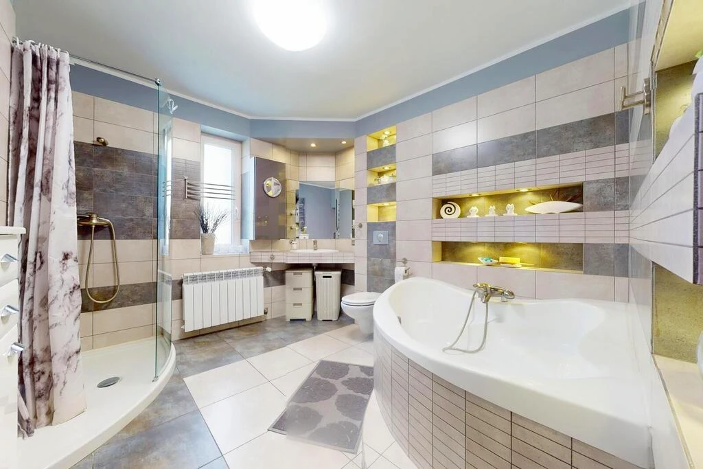 Die Immobilie bietet zwölf moderne Badezimmer und erstreckt sich über zwei Etagen, inklusive Erdgeschoss. Sie ist vollständig mit Strom und Gas versorgt.