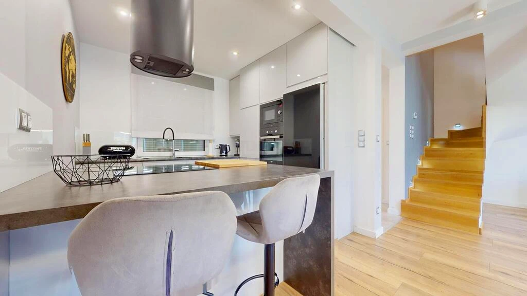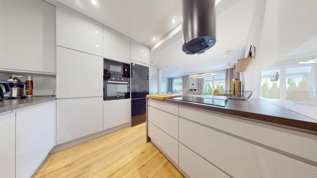 - Halb offene Küche (ca. 8 m²) mit moderner, maßgefertigter Einbauküche.